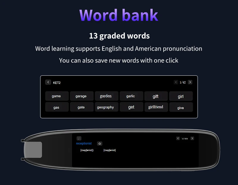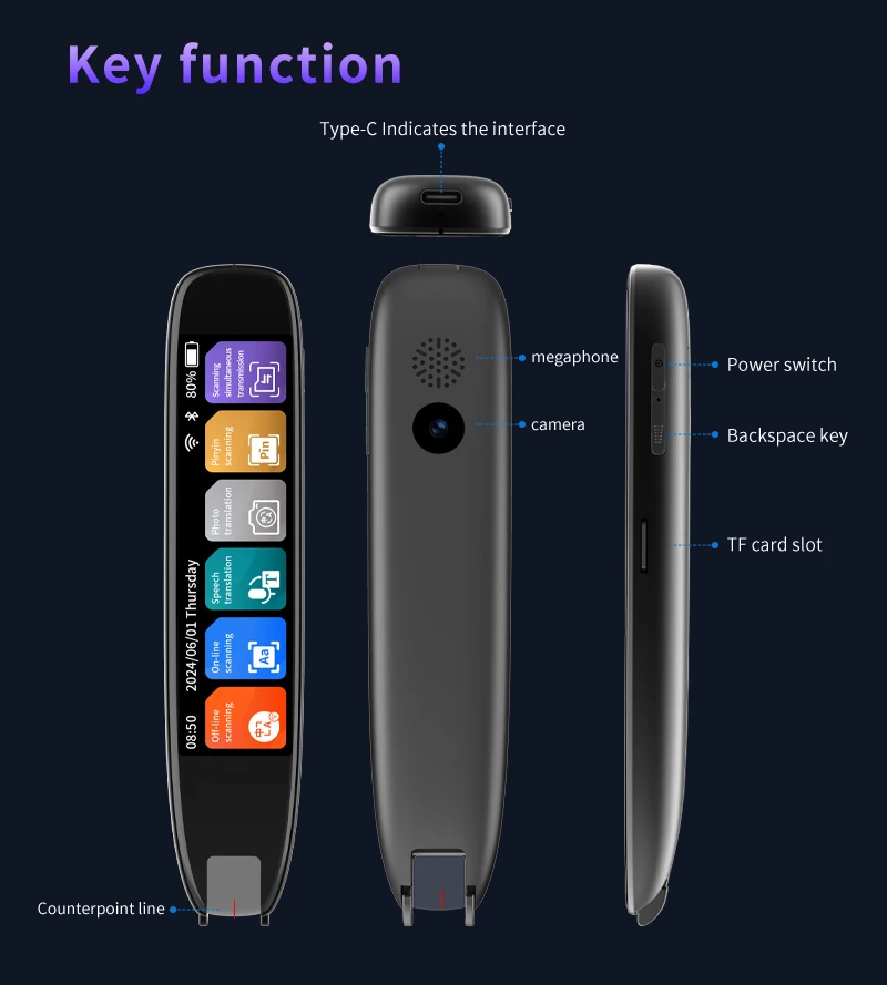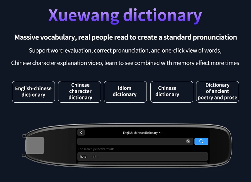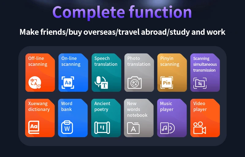 Ideal Learning Tool: With its extensive collection of English and Chinese words, as well as ancient poems, the Translation Pen Scanner serves as an ideal learning tool. It supports audio recording, MP3 playback, and video playback, allowing users to enhance their language learning experience through immersive multimedia features.