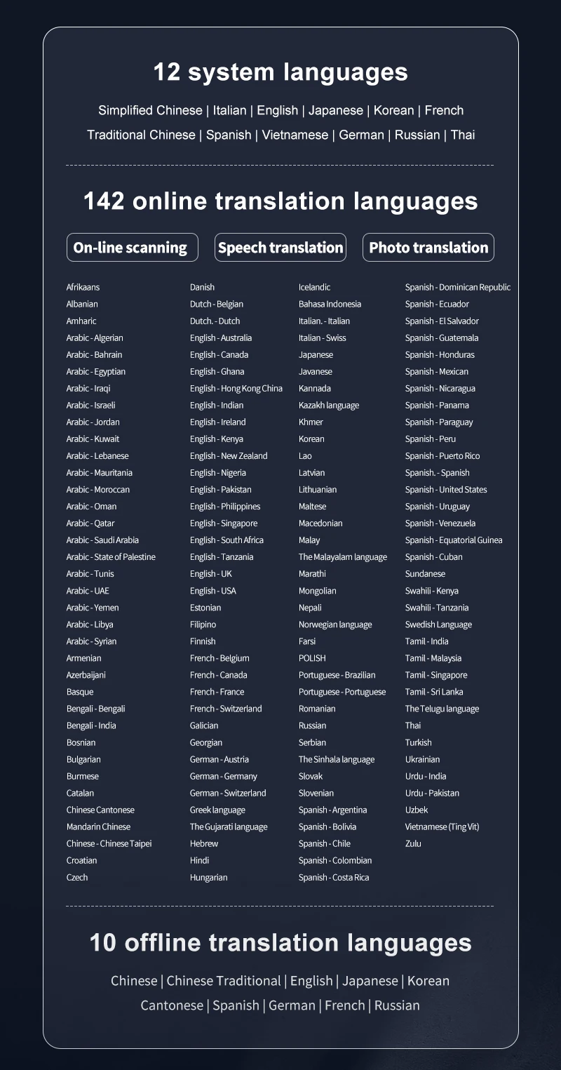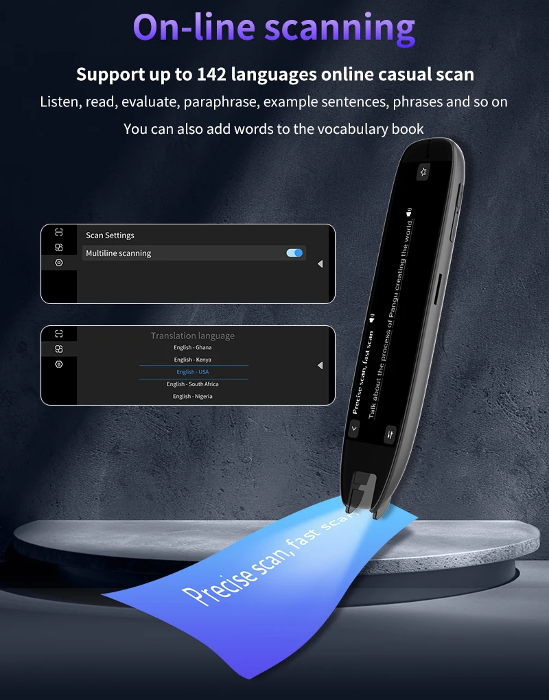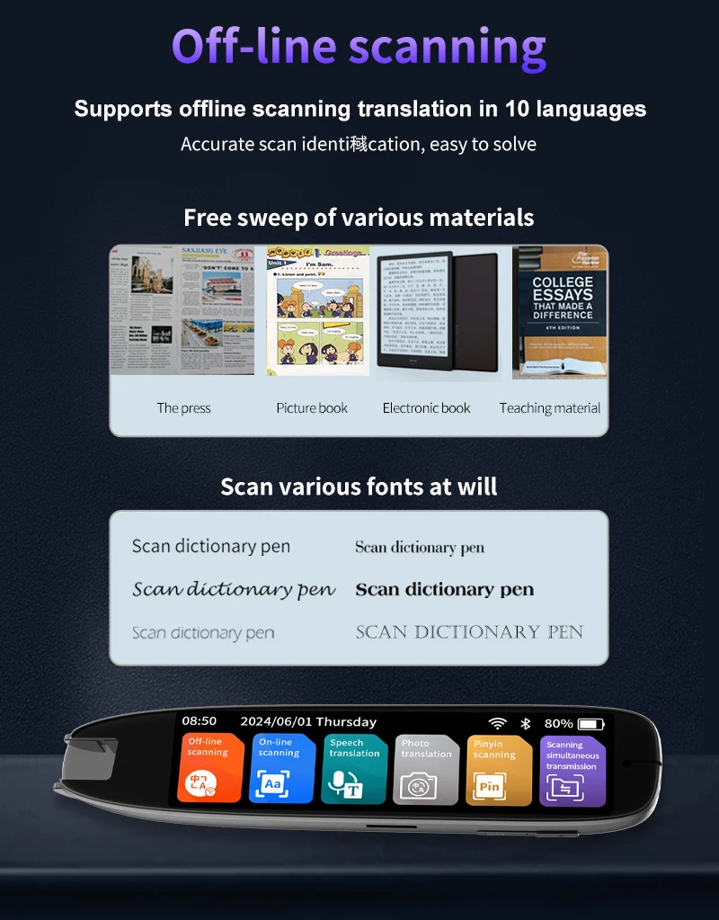 Multilingual Translation Capabilities: Equipped with 142 online scanning / online voice translation / online Photo translation options, the Translation Pen Scanner meets the diverse language translation needs. It also supports pinyin scanning for accurate translations in different languages. Additionally, it offers 10 offline scanning functions, allowing text translation without requiring an internet connection.