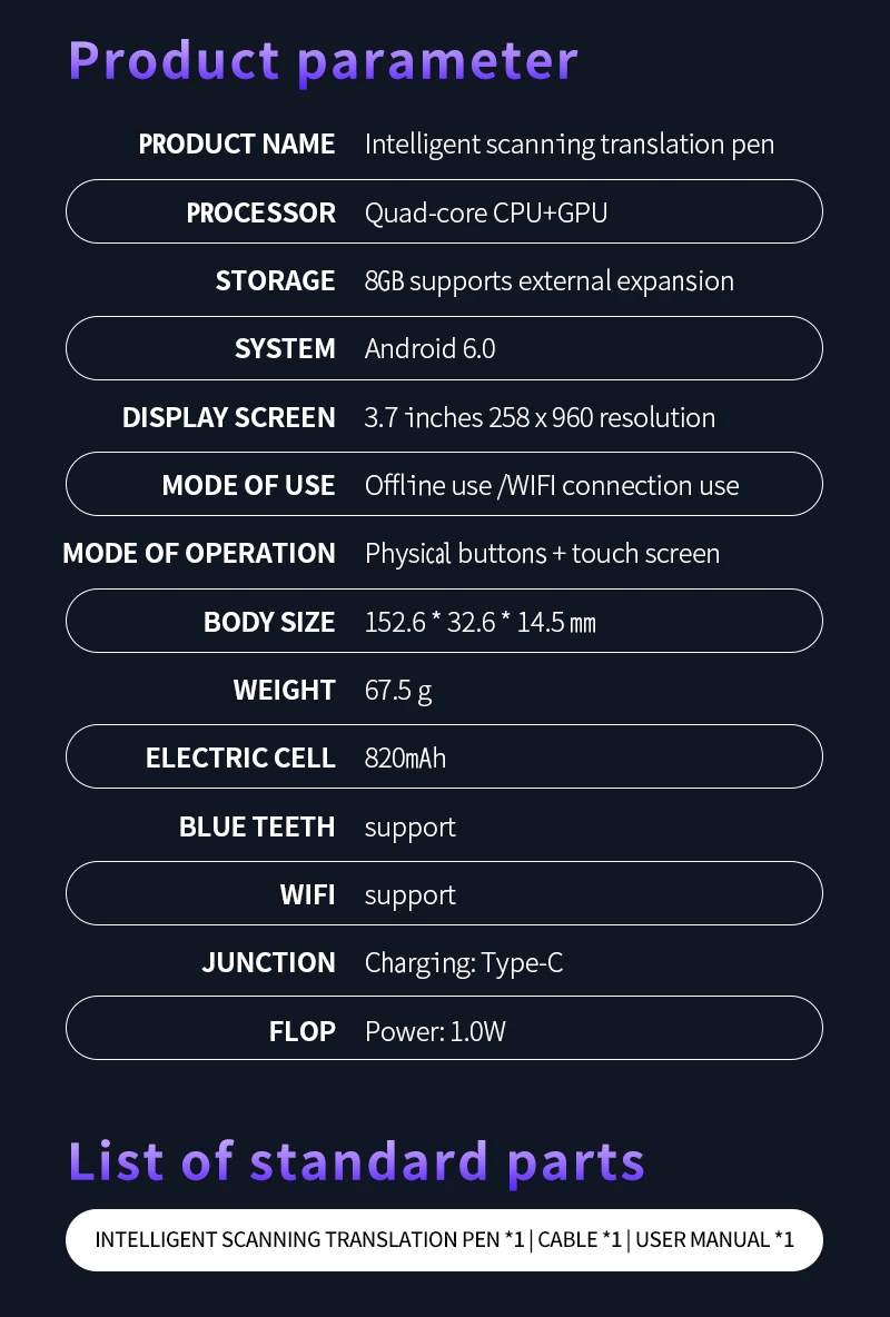 Versatile Connectivity Options: This versatile pen scanner can be connected to the internet via BT or wifi, offering more convenience during usage. Users can easily connect to their preferred network and access various online resources for enhanced translation experiences. Furthermore, the built-in 820mAh lithium battery ensures a quick 2-hour full charge, enabling prolonged usage.